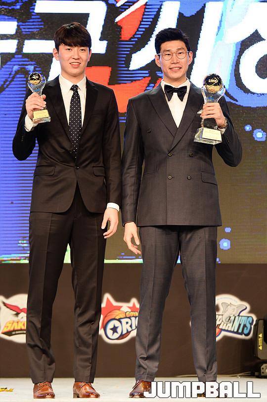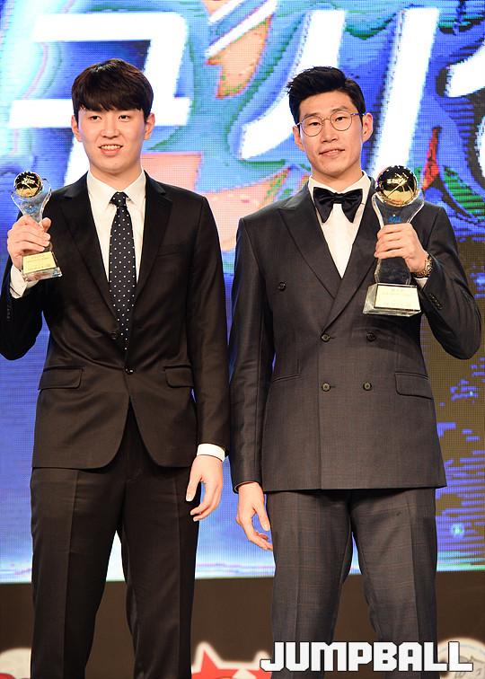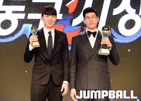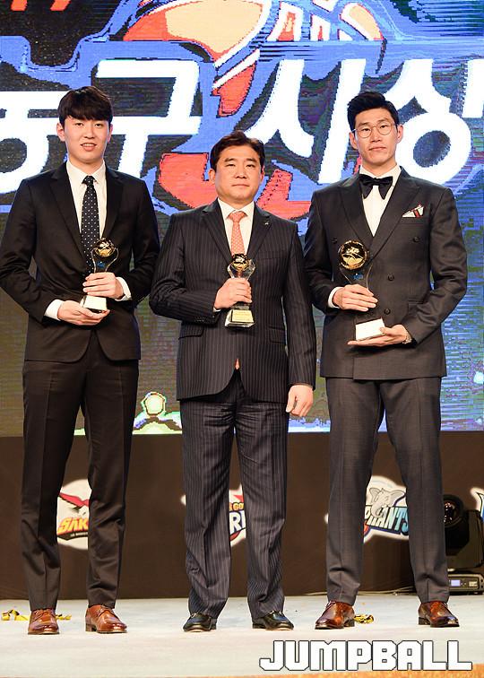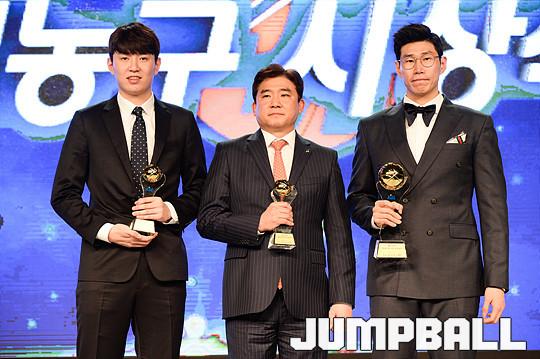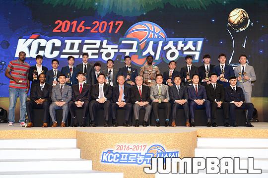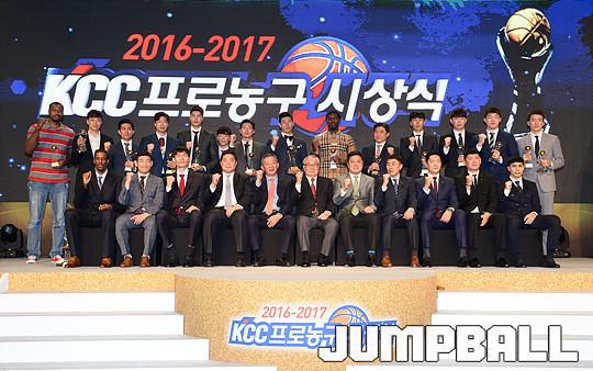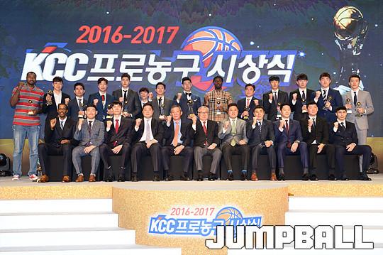 [점프볼=용산/유용우 기자] 27일 그랜드 하얏트 호텔 그랜드볼룸에서 열린 '16-17 KCC 프로농구 시상식' 수상자들이 단체촬영에 임하고 있다.