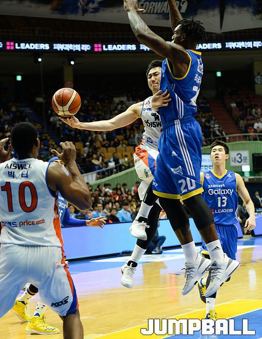 [점프볼=잠실/유용우 기자] 02일 잠실 실내체육관에서 열린 서울 삼성과 인천 전자랜드의 6강 플레이오프 2차전 경기, 전자랜드 정영삼이 돌파하며 패스를 내주고 있다.