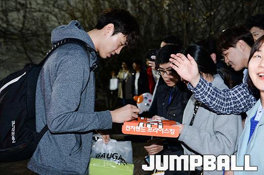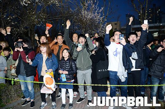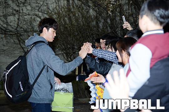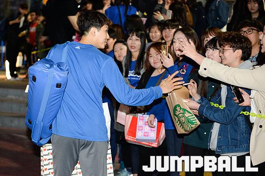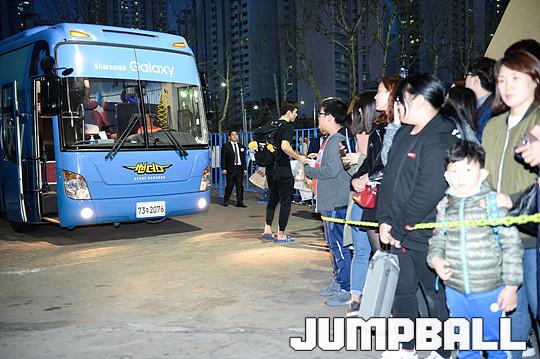 [점프볼=잠실/유용우 기자] 02일 잠실 실내체육관에서 열린 서울 삼성과 인천 전자랜드의 6강 플레이오프 2차전 경기, 경기를 마치고 양팀 선수들이 팬들에게 감사의 인사를 표하며 버스로 향하고 있다.