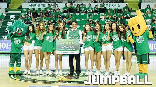 [점프볼=원주/유용우 기자] 03일 원주 종합체육관에서 열린 원주 동부와 울산 모비스의 6강 플레이오프 3차전 경기, 동부 프로미 그린엔젤스가 KBL 게토레이 인기상 수상 상금을 연고지역 불우이웃돕기 성금으로 전달하였다.