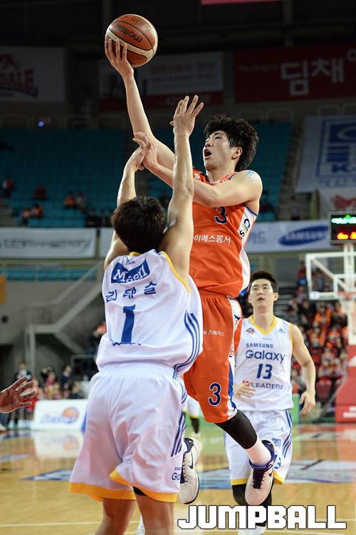 06일 인천 삼산체육관에서 열린 인천 전자랜드와 서울 삼성의 6강 플레이오프 4차전 경기, 전자랜드 김지완이 삼성 김태술의 수비를 피해 레이업슛을 시도하고있다.