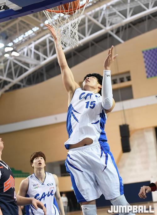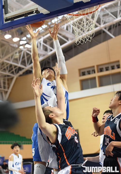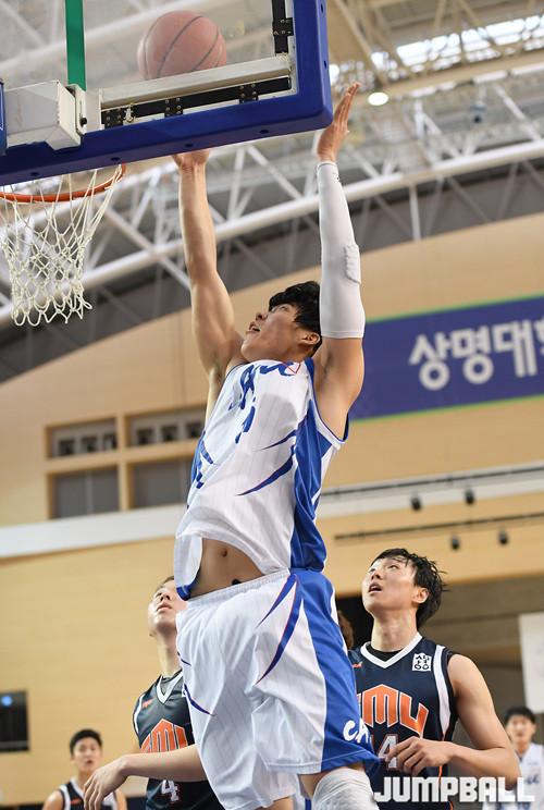 7일 천안 상명대학교 체육관에서 열린 2017 남녀 대학농구리그에서 상명대와 중앙대의 경기, 중앙대 박진철이 골밑을 장악하고 공격리바운드와 골밑슛을 시도하고 있다.
