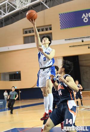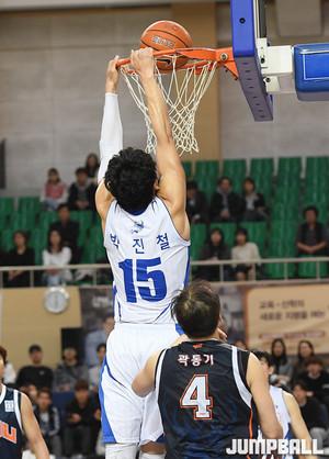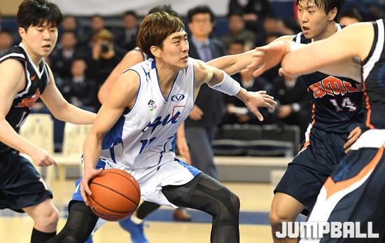 7일 천안 상명대학교 체육관에서 열린 2017 남녀 대학농구리그에서 상명대와 중앙대의 경기, 중앙대 양홍석이 골밑에서 파이팅 넘치는 공격력으로 골밑 돌파를 시도하고 있다.