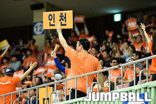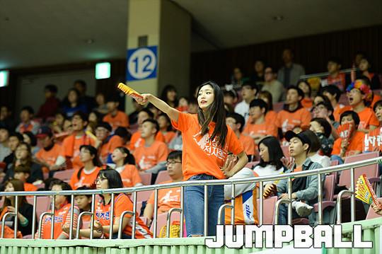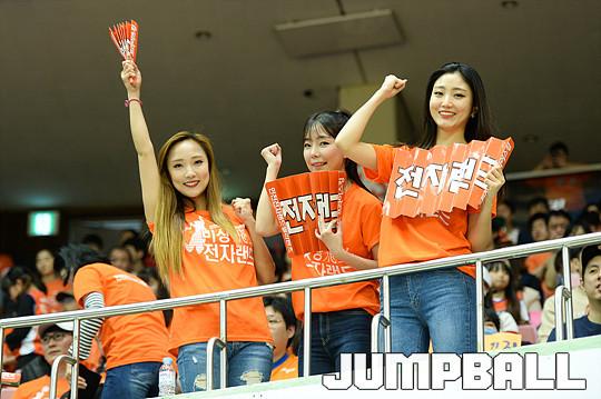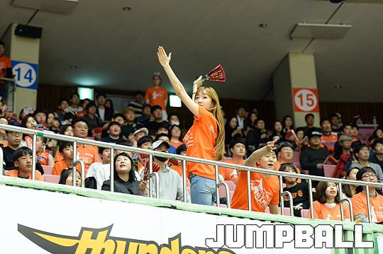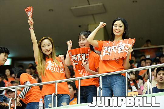 [점프볼=잠실실내체/유용우 기자] 08일 잠실 실내체육관에서 열린 서울 삼성과 인천 전자랜드의 6강 플레이오프 5차전 경기, 전자랜드 원정 응원단을 이끌고 전자랜드 치어리더들이 선수들을 응원하고 있다.