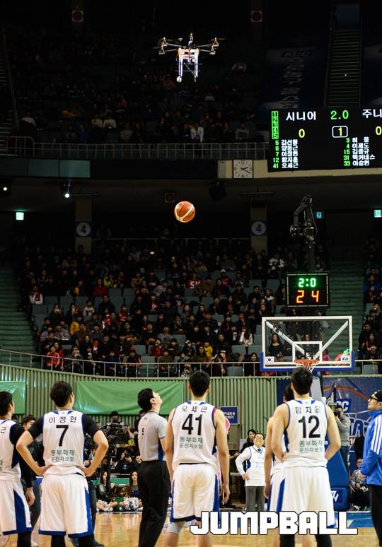 [점프볼=권부원 편집인] 드론이 농구코트 상공을 비행하더니 페인트 존에 공을 떨어뜨린다. 바닥을 한번 튀기고 올라온 공을 잡은 선수는 림을 향해 솟아올라 덩크슛을 터트린다. 인간과 기계의 콜라보다.