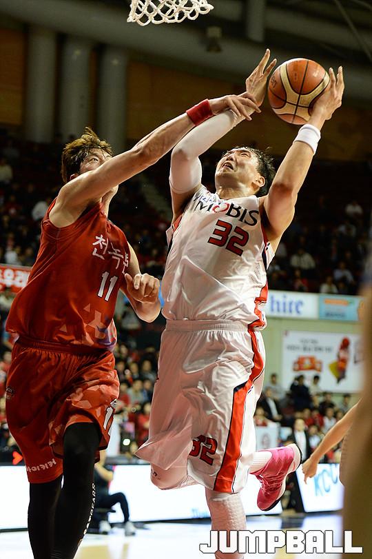 [점프볼=안양실내체/유용우 기자] 10일 안양 실내체육관에서 열린 안양 KGC 인삼공사와 울산 모비스의 4강 플레이오프 1차전 경기, 모비스 이종현이 KGC 양희종에게 파울을 당하고 있다.