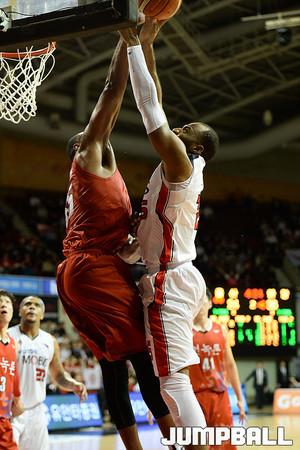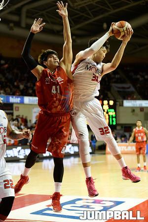 [점프볼=안양실내체/유용우 기자] 10일 안양 실내체육관에서 열린 안양 KGC 인삼공사와 울산 모비스의 4강 플레이오프 1차전 경기, KGC 사익스가 모비스 양동근과 매치업을 벌이고 있다.
