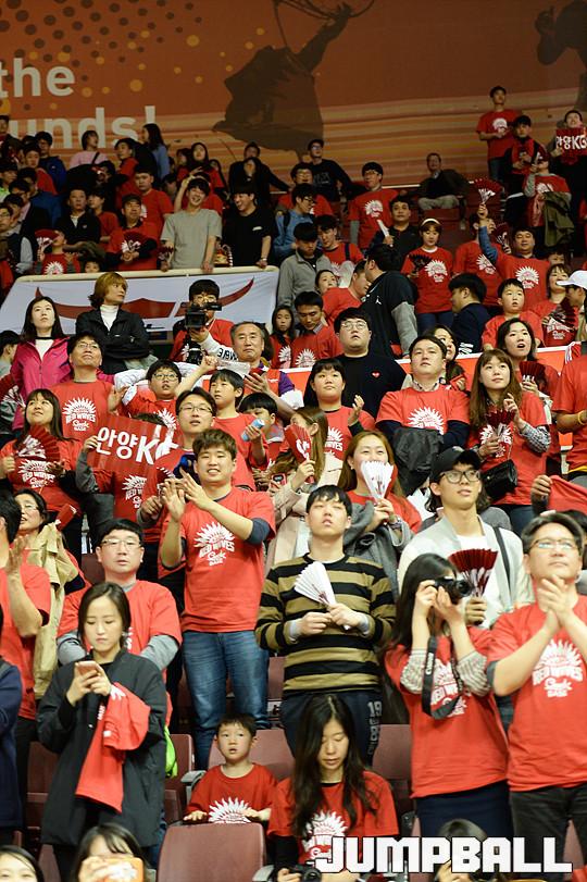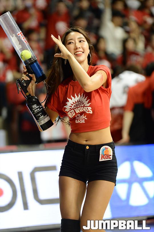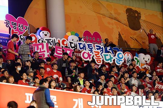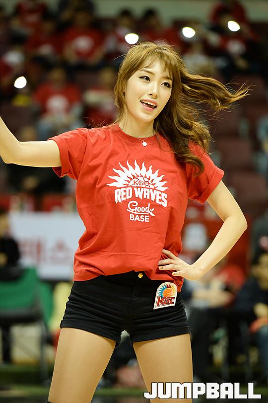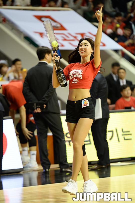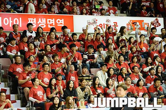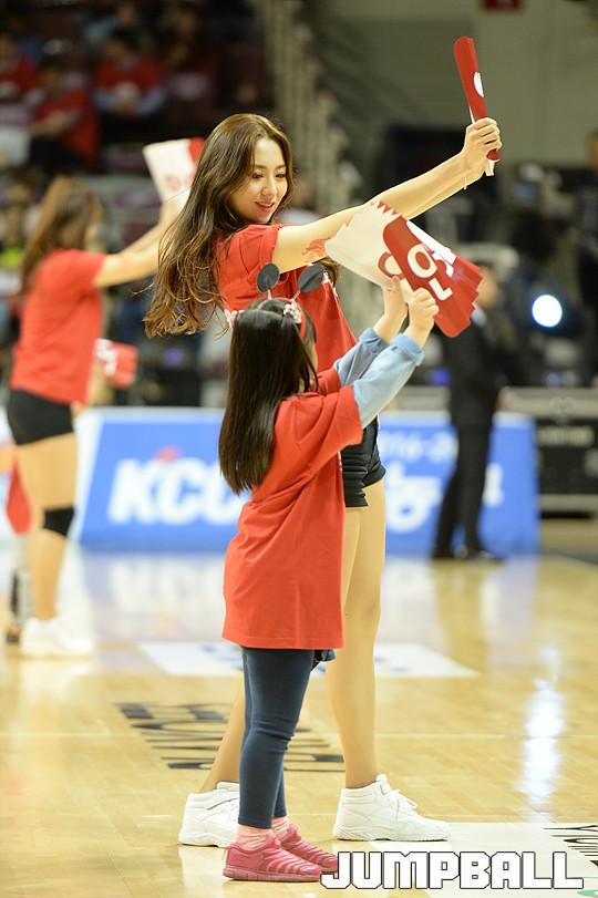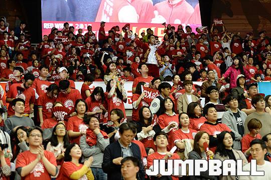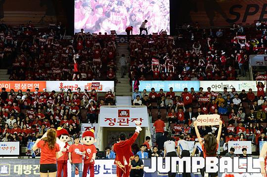 [점프볼=안양실내체/유용우 기자] 10일 안양 실내체육관에서 열린 안양 KGC 인삼공사와 울산 모비스의 4강 플레이오프 1차전 경기, KGC 인삼공사 치어리더팀이 홈팬들과 함께 승리를 위해 응원전을 펼치고 있다.