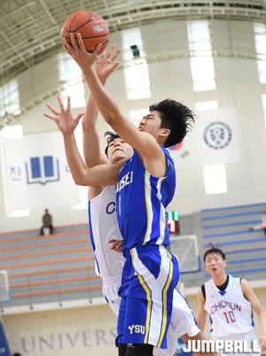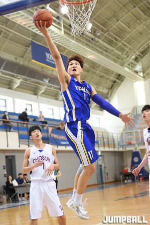 11일 신촌 연세대학교 체육관에서 열린 2017 남녀 대학농구리그에서 연세대와 조선대의 경기, 연세대 양재혁이 골밑에서 허훈의 굿어시스트를 받아서 여유있게 골밑슛을 시도하고 있다.