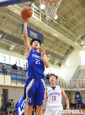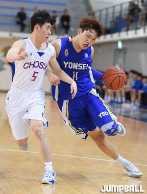 11일 신촌 연세대학교 체육관에서 열린 2017 남녀 대학농구리그에서 연세대와 조선대의 경기, 연세대 허훈이 하프라인을 여유있게 넘어 공격 패턴을 지시하고 있다.