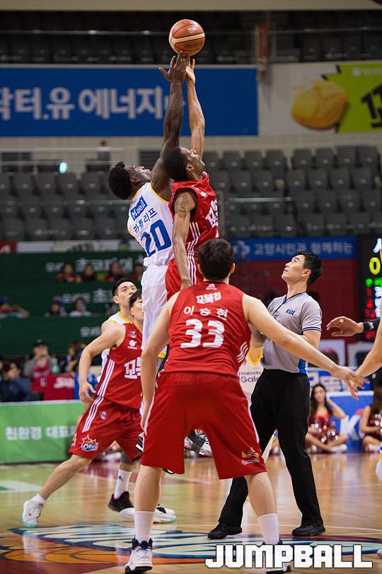 [점프볼=고양실내체/유용우 기자] 11일 고양 실내체육관에서 열린 고양 오리온과 서울 삼성의 4강 플레이오프 1차전 경기, 삼성 라틀리프와 오리온 헤인즈가 점프볼로 4강 플레이오프 1차전을 시작하고 있다.