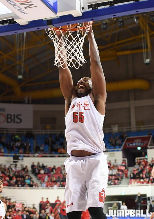 14일 울산 동천체육관에서 열린 울산 모비스와 안양 KGC인삼공사의 4강 플레이오프 3차전 경기, KGC인삼공사 사이먼이 사익스의 덩크 실패를 파워덩크로 마무리하고 있다.