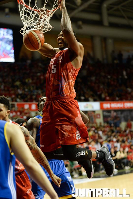 [점프볼=안양실내체/유용우 기자] 22일 안양 실내체육관에서 열린 안양 KGC 인삼공사와 서울 삼성의 '2016-2017 KCC 프로농구' 챔피언 결정전 1차전 경기, KGC 사이먼이 덩크를 하고 있다.