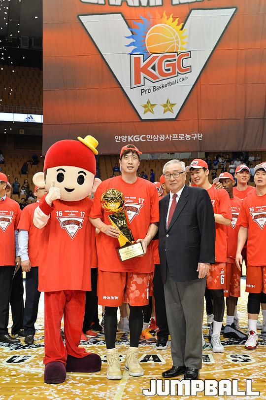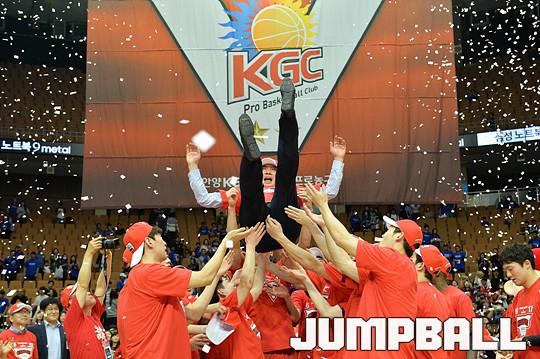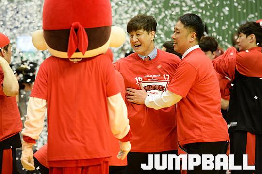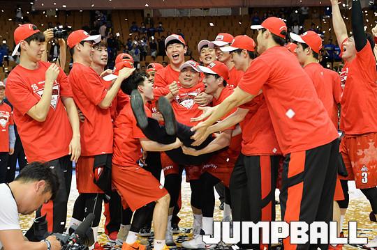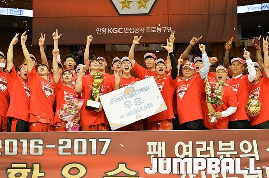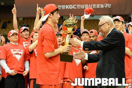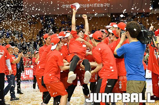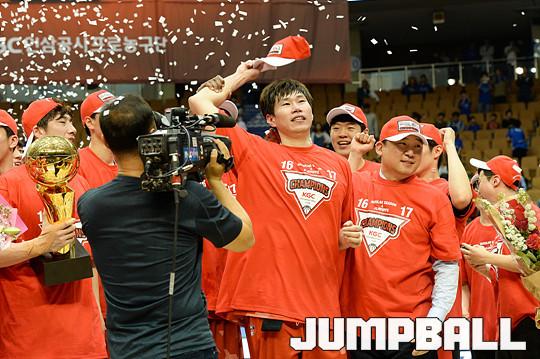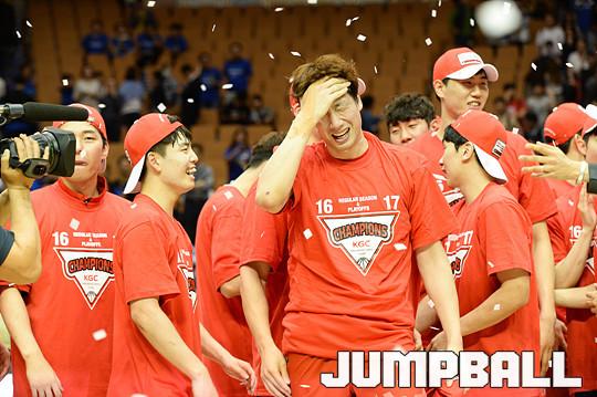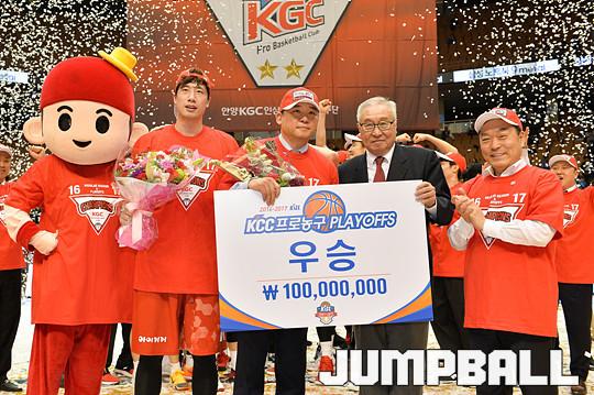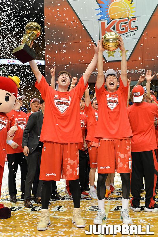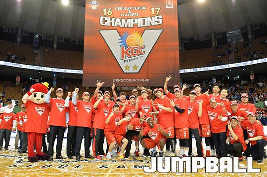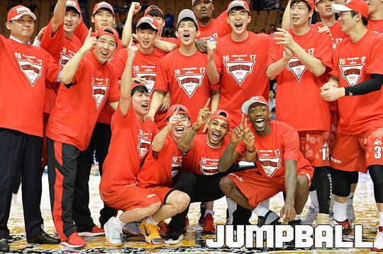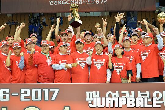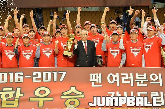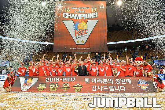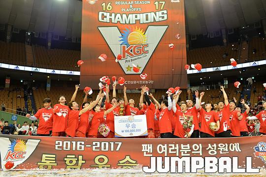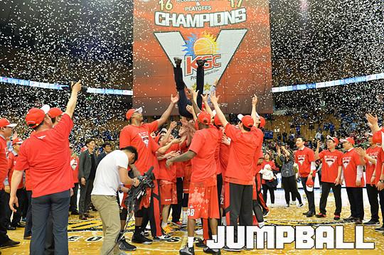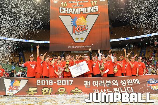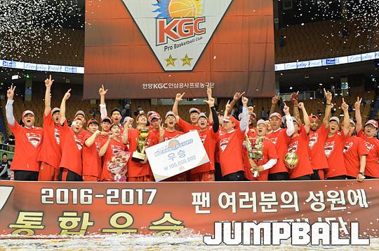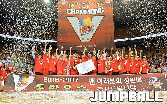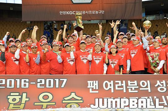 [점프볼=잠실실내체/유용우 기자] 02일 잠실 실내체육관에서 열린 서울 삼성과 안양 KGC 인삼공사의 '2016-2017 KCC 프로농구' 챔피언 결정전 6차전 경기, KGC 인삼공사가 삼성을 88-86으로 이기며 챔피언 트로피의 주인공이 되었다. KGC 인삼공사의 우승 세레머니 화보