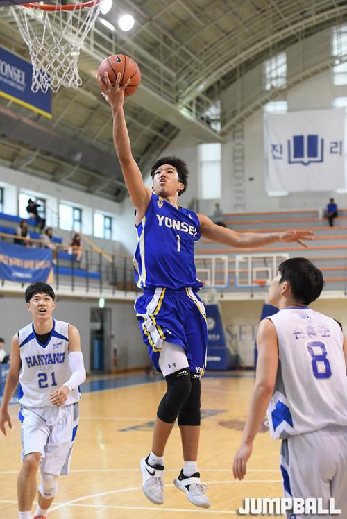 26일 신촌 연세대 체육관에서 열린 2017 남녀 대학농구리그에서 연세대와 한양대의 경기, 연세대 박지원이 골밑 중앙을 제치있게 파고들어 레이업 시도하고 있다.