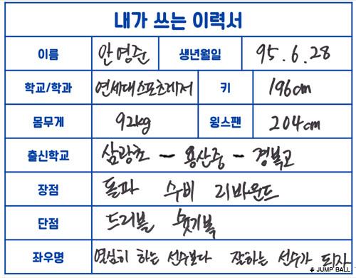[점프볼=강현지 기자] 2017년 신인 드래프트에 도전하는 '예비 프로'가 쓰는 취업 이력서. 첫 주인공은 연세대 안영준(22, 196cm)이다. 1편에서 그가 걸어온 길을 돌아 봤다면, 이번에는 앞으로의 안영준에 대해 살펴봤다. 인사 담당자들이 주목해야할 대목이다. 안영준의 #성격과 #입사 후 포부를 들어보자.