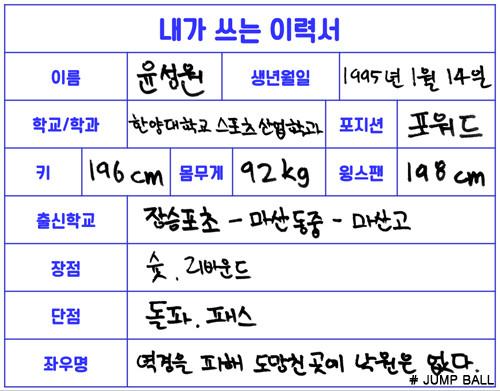 [점프볼=강현지 기자] 2017년 신인 드래프트에 도전하는 ‘예비 프로’가 쓰는 취업 이력서. 4탄의 주인공은 한양대학교의 주장, 윤성원(22, 196cm)이다. 거제에 살던 한 소년이 회사원이 아닌 농구선수의 꿈을 가지게 된 과정에는 어떤 뒷이야기가 있었을까. 선수 준비를 늦게 시작한 탓에 성장 속도는 남들보다 더디지만, 윤성원은 이렇게 말한다. 그래서 잠재력이 더 풍부하고, 보여주지 못한 장점들이 더 많다고 말이다.