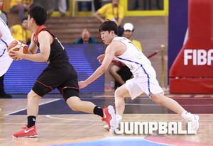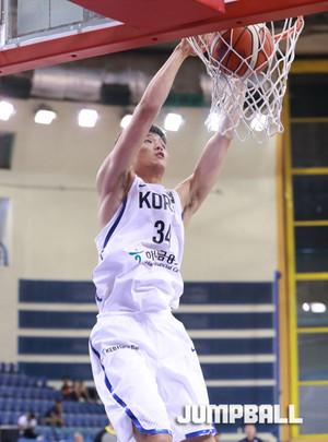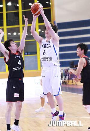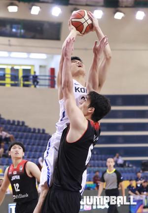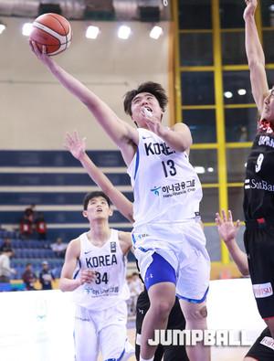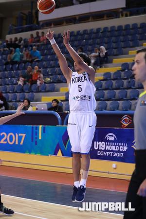 한국 시간 8일 새벽 이집트 카이로 스타디움에서 열린 2017 FIBA U19남자 농구 월드컵 한국과 일본의 9-16위 순위 결정전, 한국 U19남자 농구 대표팀의 윤원상이 수비 사이에서 특유의 돌파에 이은 슛을 던지고 있다.