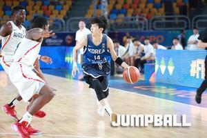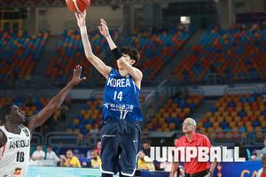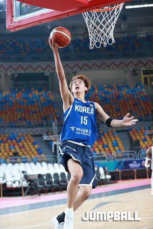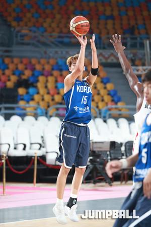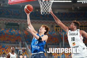 한국시간 9일 이집트 카이로에서 열린 2017 FIBA U19남자 농구 월드컵 13-14위 순위 결정전, 한국 U19남자 농구 대표팀의 박지원이 수비가 막아서지 않자 직접 슛을 시도하고 있다.