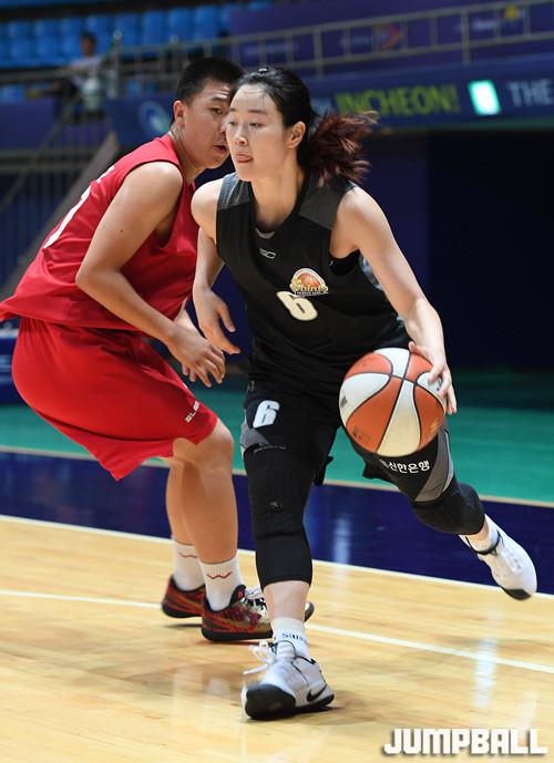 신한은행 에스버드가 11일 인천 도원체육관에서 열린 휘문중과의 연습경기, 신한은행 김아름이 수비를 제치고 골밑으로 돌진하고 있다.