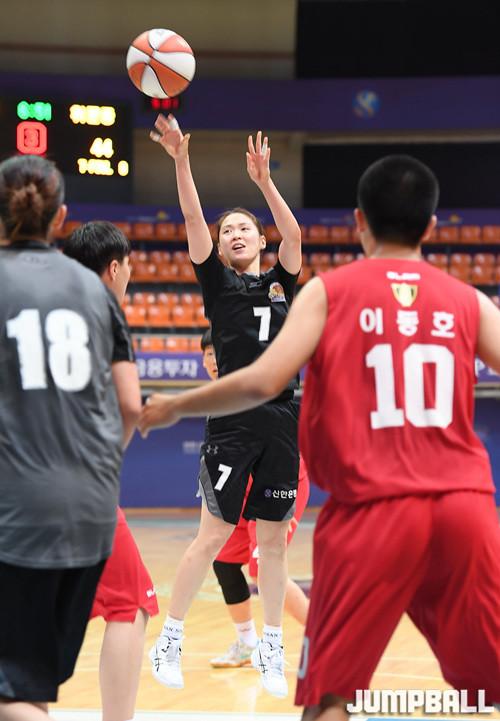 신한은행 에스버드가 11일 인천 도원체육관에서 열린 휘문중과의 연습경기, 신한은행 윤미지가 거침없이 중거리슛을 던지고 있다.