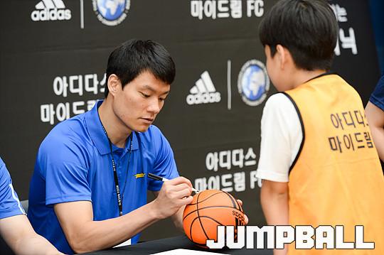 [점프볼=잠실/유용우 기자] 아디다스코리아와 서울삼성썬더스농구단와 함께하는 '아디다스 마이드림 FC ' 농구 클리닉이 12일 잠실 실내 체육관 서울삼성리틀썬더스 경기장에서 진행했다. 서울삼성썬더스의 김태형, 이동엽, 천기범 선수가 참여한 이번 클리닉은 초등학교 4,5,6 학년으로 구성된 20여 명의 ‘아디다스 마이드림 FC’ 학생들이 기본 훈련법부터 드리블, 패스, 슛팅 등 농구 실전 기술들을 삼성 선수들에게 배웠다.삼성 김태형이 아이들에게 줄 싸인볼에 싸인을 하고 있다.