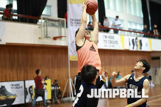 16일 상명대 서울 캠퍼스 체육관에서 열린 아디다스 크레이지코트 2017, 일반부 투사팀과 범계 OB팀의 대결에서 범계OB팀의 선수가 몸을 젖히며 리바운드를 잡아내고 있다.