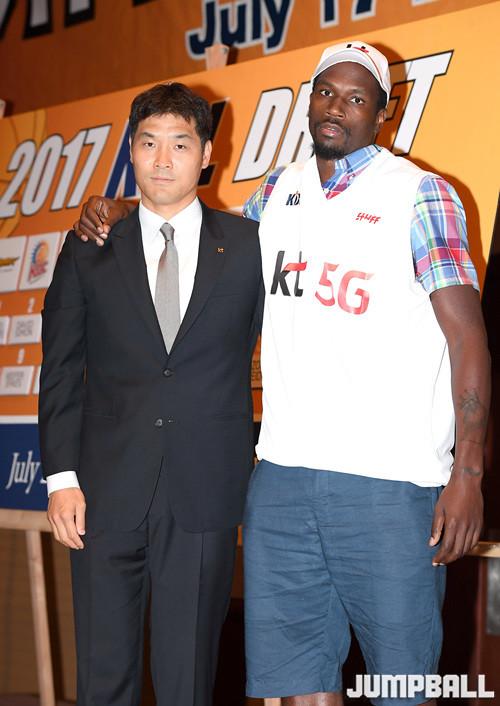 20일(미국시간) 오전 미국 네바다주 라스베이거스 팜스호텔에서 열린 2017년 KBL 외국선수 트라이아웃 & 드래프트에 kt 조동현 감독이 2라운드 4순위로 테렌스 왓슨을 선발하고 기념촬영을 하고 있다.