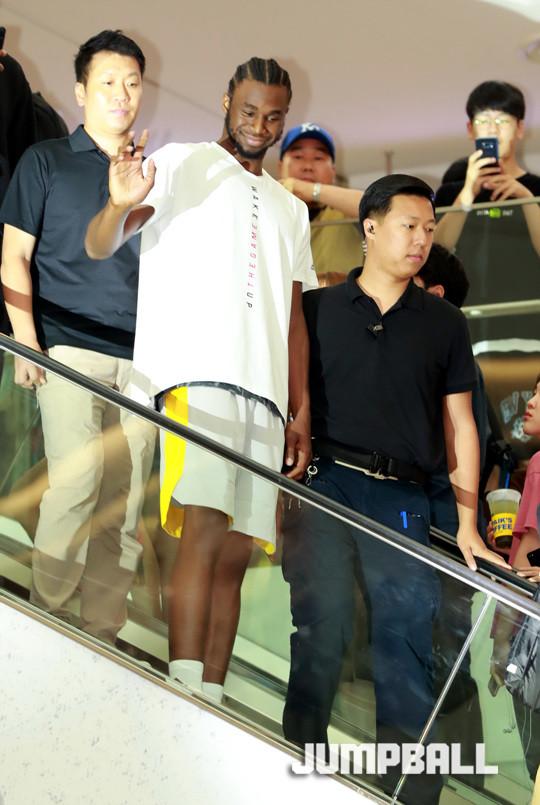 23일 영등포 타임스퀘어 아트리움 특설 코트에서 '아디다스 크레이지코트 2017' 앤드류 위긴스가 에스컬레이터를 타고 내려오며 자신을 향해 환호하는 팬들에게 손을 들어 화답하고 있다.