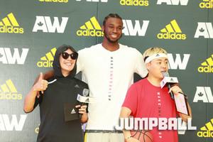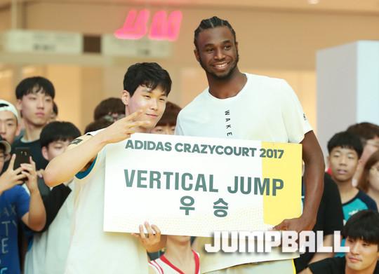 23일 영등포 타임스퀘어 아트리움 특설 코트에서 '아디다스 크레이지코트 2017' 앤드류 위긴스가 참석한 가운데 열린 버츄얼 점프에서 우승을 차지한 선수와 앤드류 위긴스가 기념촬영을 하고 있다.