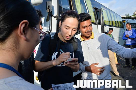 [점프볼=벵갈루루/유용우 기자] 24일 인도 벵갈루루에 위치한 스리칸티라바 스타디움에서 열린 '2017 FIBA 여자농구 아시아컵' 한국과 일본의 디비젼A 예선경기를 마치고 나가는 여자농구대표팀에게 응원단이 싸인과 셀피를 찍는등 팬심을 과시하고 있다. 응원단은 필리핀과의 예선 3차전에 승리하라고 응원의 메세지를 선수들에게 보냈다. 대표팀 김단비가 중학생 팬들에게 싸인을 해주고 있다.
