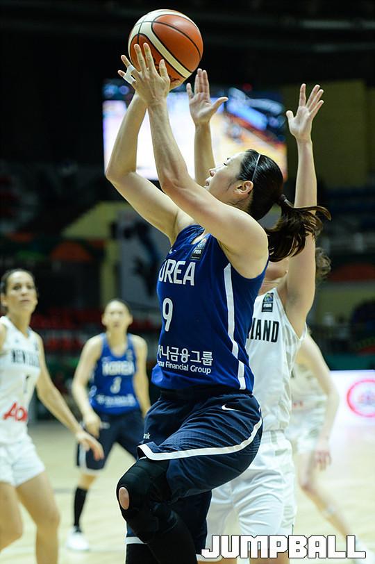 [점프볼=벵갈루루/유용우 기자] 27일 인도 벵갈루루에 위치한 스리칸티라바 스타디움에서 열린 '2017 FIBA 여자농구 아시아컵' 한국과 뉴질랜드의 8강경기, 여자농구대표팀 곽주영이 골밑공격을 성공시키고 있다.