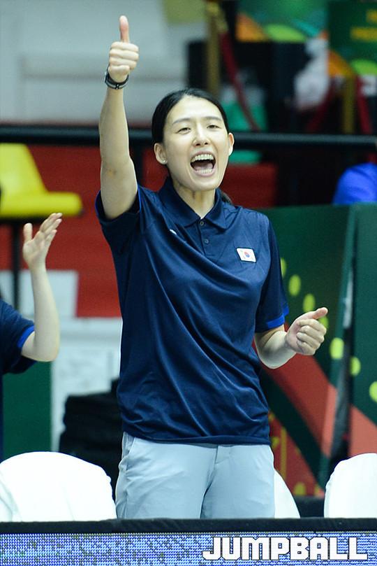 [점프볼=벵갈루루/유용우 기자] 27일 인도 벵갈루루에 위치한 스리칸티라바 스타디움에서 열린 '2017 FIBA 여자농구 아시아컵' 한국과 뉴질랜드의 8강경기, 여자농구대표팀 전주원 코치가 곽주영이 득점에 성공하자 엄지를 치켜들고 있다.