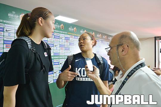 선수들 돕기위해 빠진 통역을 대신해 박지수의 인터뷰를 돕고 있다.
