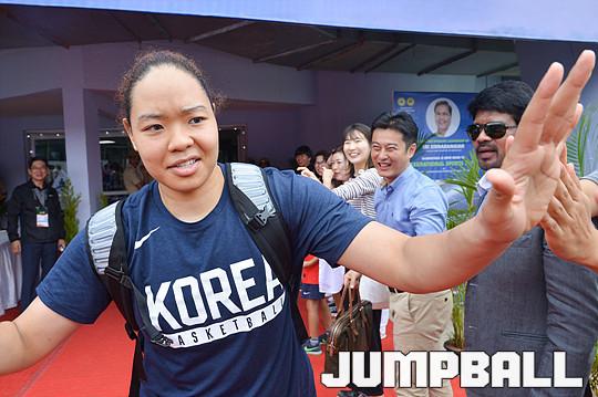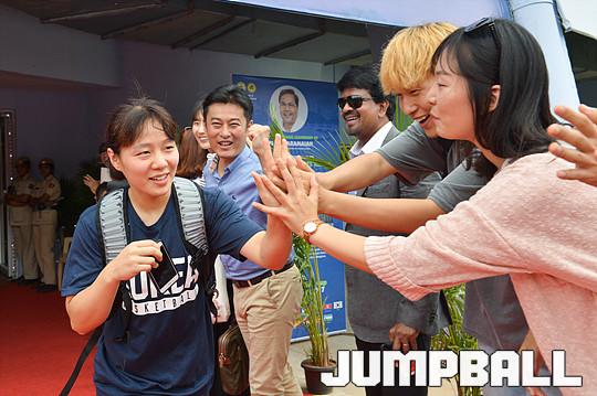 한국은 4강전에 오르며 2018년 9월 스페인에서 열리는 FIBA 월드컵 출전권까지 획득했다. 한국 심성영이 체육관을 빠져 나오면서 응원을 위해 체육관을 찾은 교민들과 하이파이브를 하고 있다.