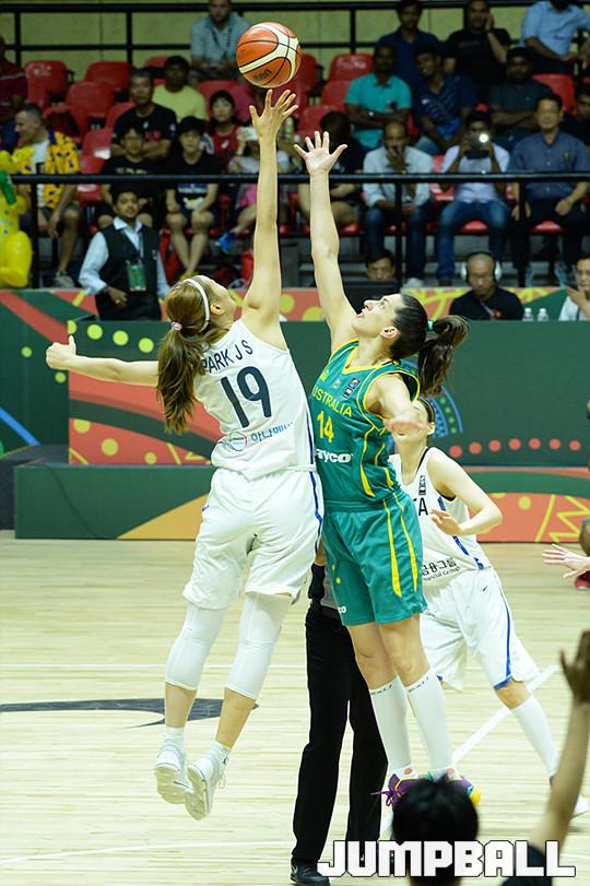 [점프볼=벵갈루루/유용우 기자] 28일 인도 벵갈루루에 위치한 스리칸티라바 스타디움에서 열린 '2017 FIBA 여자농구 아시아컵' 한국과 호주의 4강경기, 한국 박지수가 점프볼로 공격권을 가져오고 있다.