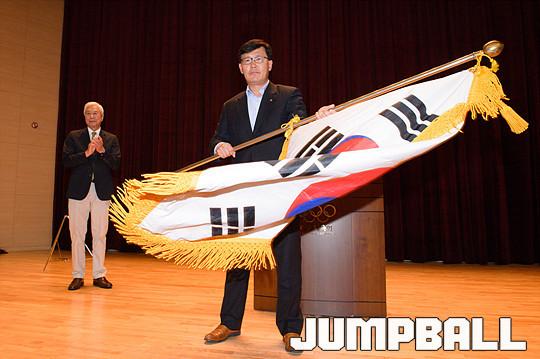 [점프볼=진천/유용우 기자] 4일 진천선수촌 대강당에서 8월 8일부터 20일까지 레바논 베이루트에서 열리는 2017 FIBA 남자농구 아시아컵에 나설 남자농구대표팀이 결단식을 가졌다. 조성인 단장이 방열 회장에게 단기를 수여 받고 흔들고 있다.