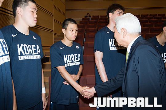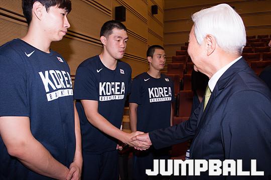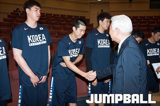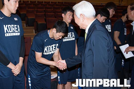 [점프볼=진천/유용우 기자] 4일 진천선수촌 대강당에서 8월 8일부터 20일까지 레바논 베이루트에서 열리는 2017 FIBA 남자농구 아시아컵에 나설 남자농구대표팀이 결단식을 가졌다. 방열 회장이 남자농구대표팀을 격려하고 있다.