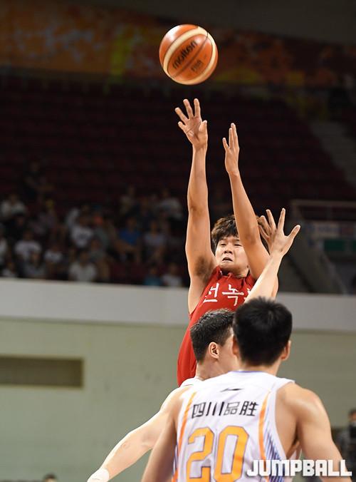 6일 안양실내체육관에서 열린 2017 정관장 동아시아 챔피언스컵으로 중국 쓰촨 핀셩과 대한민국 안양 KGC의 경기, 안양 KGC 전성현이 상대수비를 앞에두고 거침없이 3점슛을 던지고 있다.