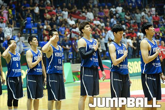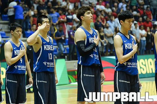 (사진설명) 경기장에 애국가가 울려 퍼지고 있다. 남자농구대표팀 선수들이 국기에 대한 경례를 하고 있다.