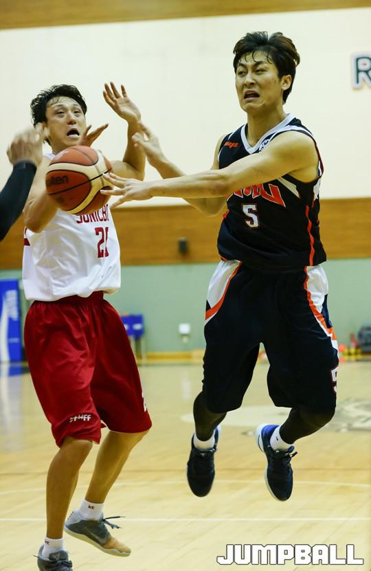 [점프볼=수원/홍기웅 기자] 17일 올레빅토리움에서 부산 KT 소닉붐과 상명대의 연습경기. 상명대 전성환이 골밑까지 들어온 후 패스를 하고 있다.