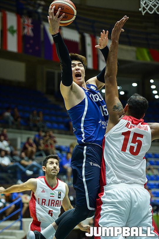 [점프볼=베이루트(레바논)/유용우 기자] 20일 레바논 베이루트, 노우하드 나우팔 체육관에서 열린 '2017 FIBA 아시아컵' 한국과 이란의 준결승 경기, 남자농구대표팀 김종규가 하다디를 상대로 골밑슛을 쏘고 있다.