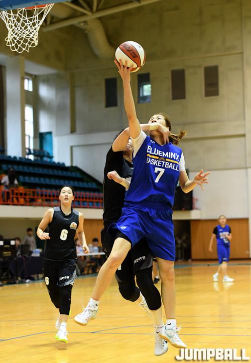 21일 강원도 속초실내체육관에서 열린 2017 우리은행 박신자컵 서머리그 개막전 용인 삼성생명 블루밍스와 인천 신한은행 에스버드의 경기에서 삼성생명 고아라가 골밑을 저돌적으로 파고들어 상대의 수비를 뿌리치며 레이업을 시도하고 있다.