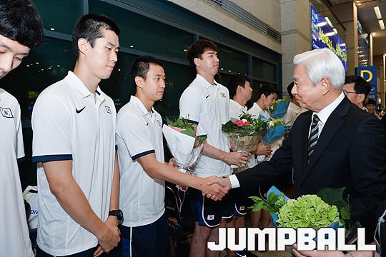 [점프볼=인천공항/유용우 기자] 22일 남자농구대표팀이 '2017 FIBA 아시아컵' 을 마치고 귀국하였다. 남자농구대표팀은 오세아니아가 합류한 이번 대회에서 이란에 아쉽게 패하며 3-4위전에서 뉴질랜드에 승리하며 3위를 차지하였다.대한농구협회 방열 회장이 대표팀 허웅에게 꽃다발을 전달하고 있다.