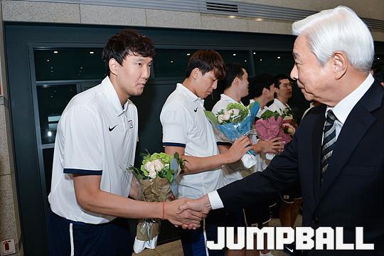 [점프볼=인천공항/유용우 기자] 22일 남자농구대표팀이 '2017 FIBA 아시아컵' 을 마치고 귀국하였다. 남자농구대표팀은 오세아니아가 합류한 이번 대회에서 이란에 아쉽게 패하며 3-4위전에서 뉴질랜드에 승리하며 3위를 차지하였다.대한농구협회 방열 회장이 대표팀 이종현에게 꽃다발을 전달하고 있다.