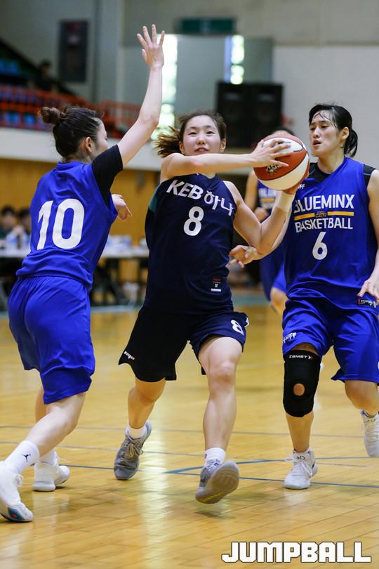 [점프볼=속초/홍기웅 기자] 26일 속초실내체육관에서 열린 2017 박신자컵 서머리그 삼성블루밍스와 KEB하나은행 경기. KEB 김지영이 유로스탭을 밟으면서 삼성의 수비를 돌파하고 있다.