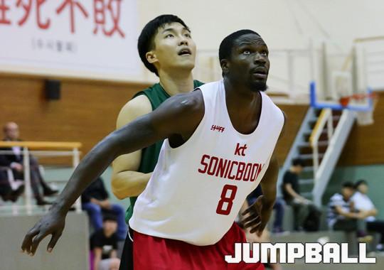 [점프볼=수원/홍기웅 기자] 1일 수원에 위치한 올레빅토리움에서 KT와 동부가 연습경기를 가졌다. KT 테런스 왓슨이 박스아웃의 정석을 보여주고 있다.