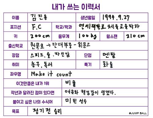 [점프볼=강현지 기자] 2017 KBL 신인선수 드래프트 참가 신청이 지난달 30일부터 시작됐다. 트라이아웃과 드래프트 날짜는 10월 30일, 즉 앞으로 56일이 남았다(9월 4일 기준). 2017년 신인 드래프트에 도전하는 '예비 프로'의 취업 이력서, 열한 번째 주인공은 연세대학교 김진용(23, 200cm)이다.