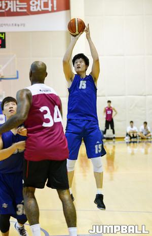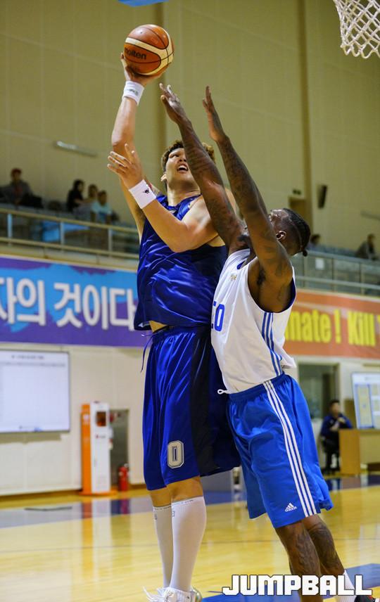 [점프볼=용인/홍기웅 기자] 5일 용인 마북리에 위치한 KCC연습경기장에서 KCC와 삼성이 연습경기를 가졌다. 연습경기 시작을 알리는 점프볼이 심판의 손에서 올려졌고 KCC 하승진이 장신을 이용해 훅 슛을 던지고 있다.