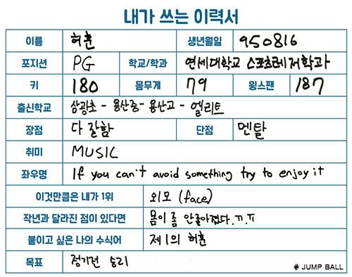 [점프볼=강현지 기자] 2017년 신인 드래프트에 도전하는 '예비 프로'의 취업 이력서. 열세 번째 주인공은 연세대학교 주장 허훈(22, 180cm)이다. 용산중-용산고-연세대까지. 이력서에 적은 것처럼 농구선수로서 ‘엘리트 코스’를 밟은 그는 2013년 처음으로 성인 국가대표팀에도 뽑히며 커리어를 쌓아왔다. 큰 경기에서 쌓은 경험, 그리고 그가 가진 실력에 허훈은 2017년 신인선수 드래프트에서 유력한 1순위 후보로 꼽히고 있다. 프로 무대 진출을 앞에 두고 있는 허훈을 만나 그가 걸어온 #성장과정, #경력사항을 들어봤다.